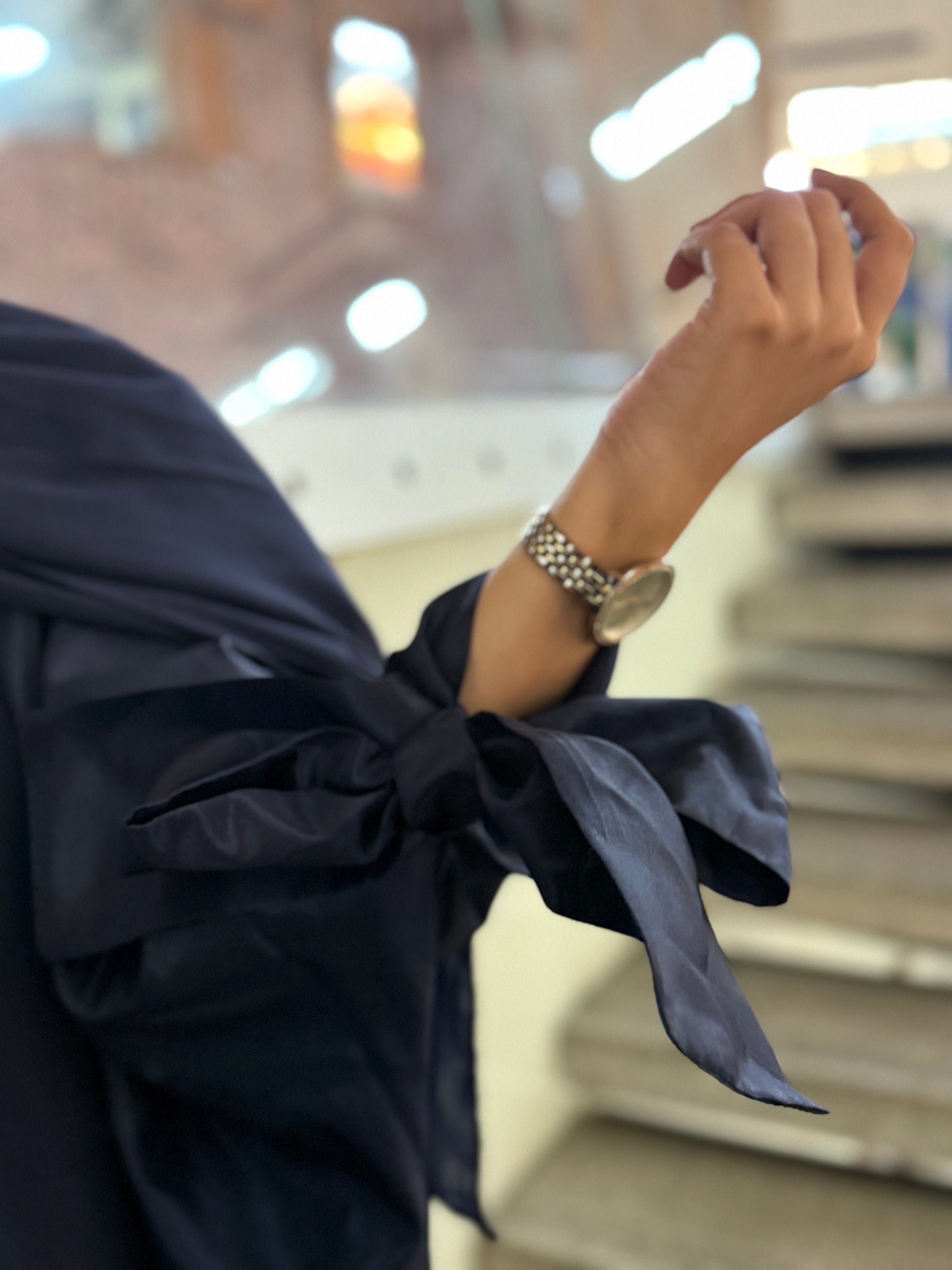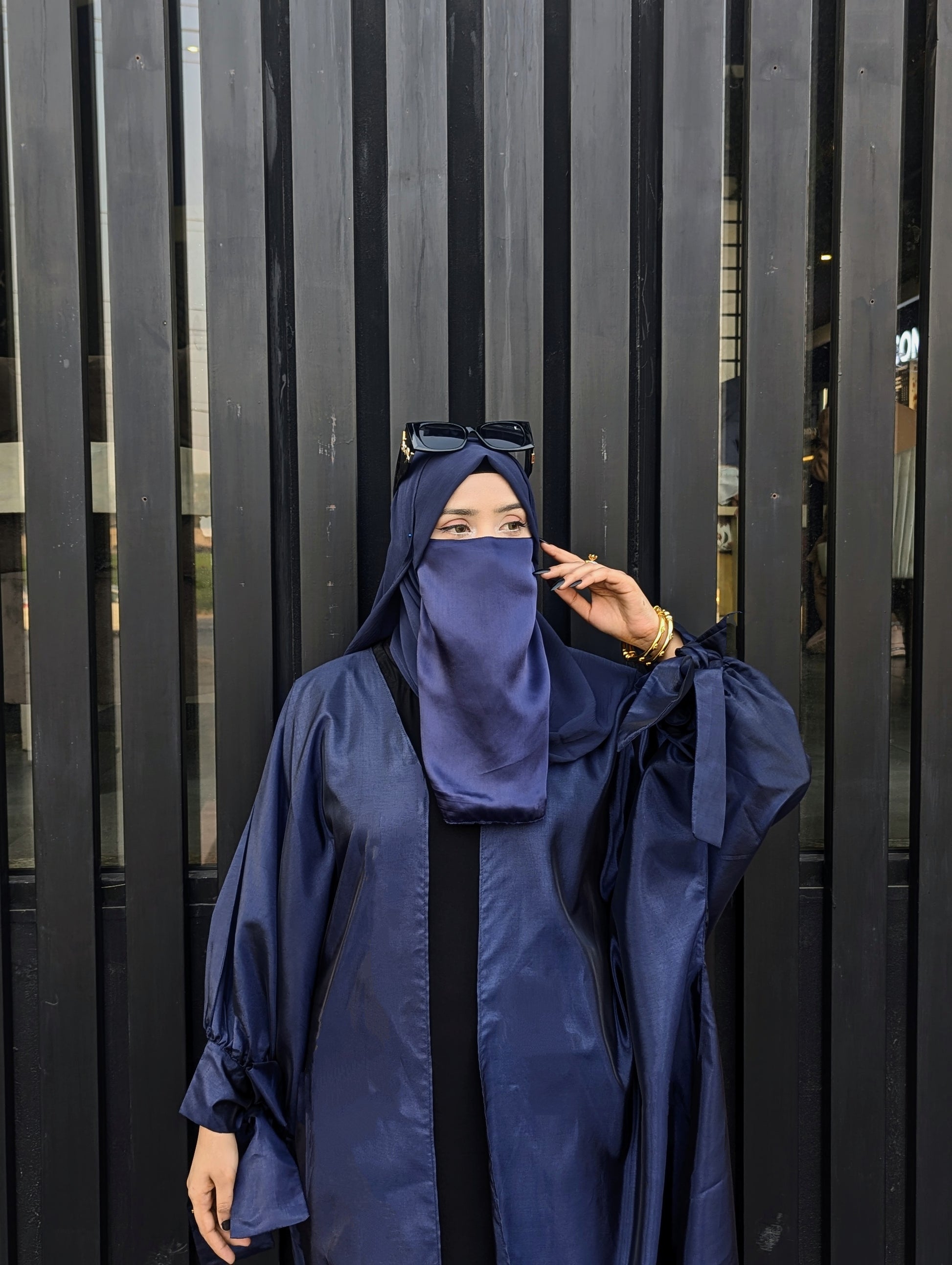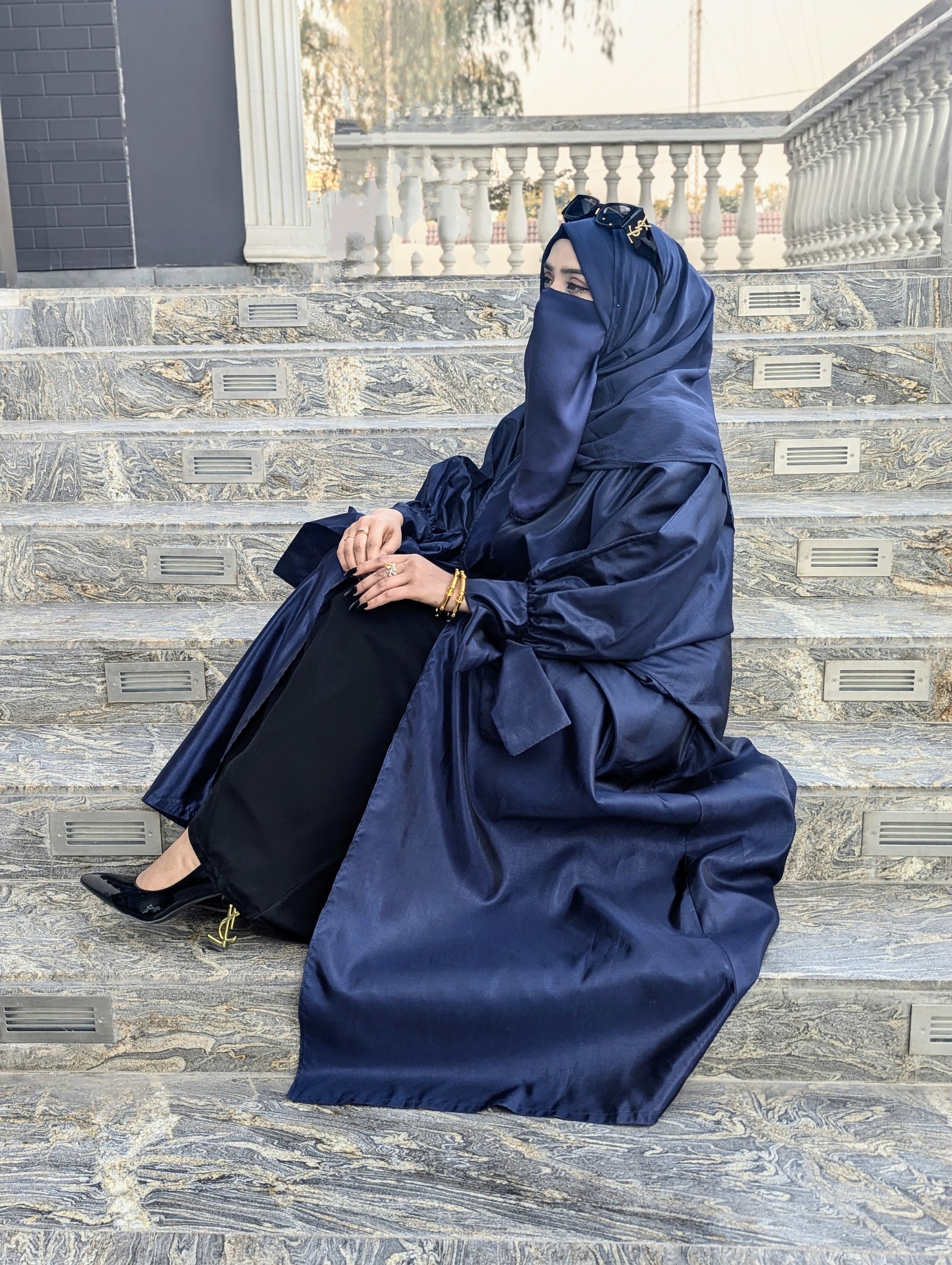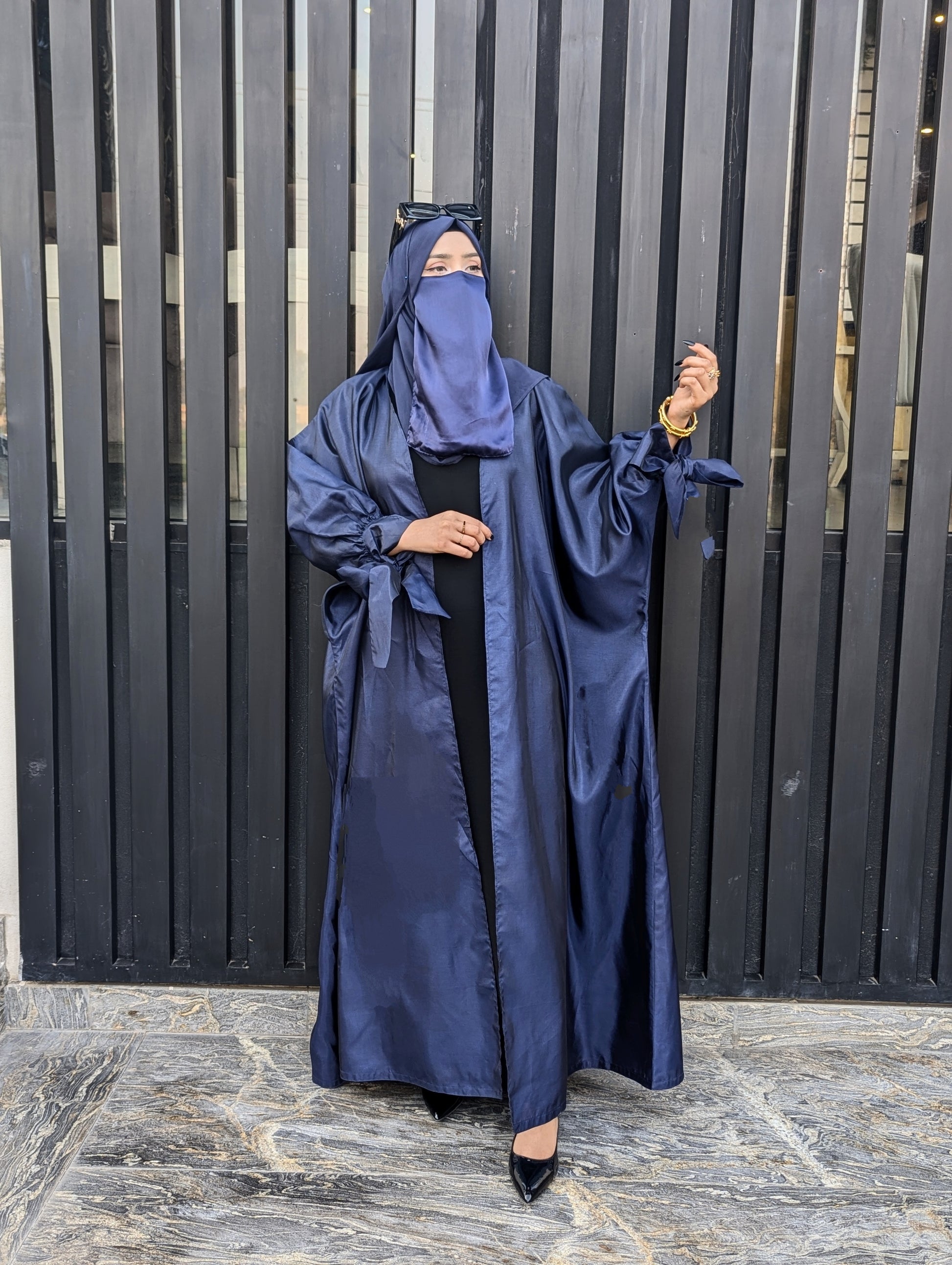 Introducing our 3-piece Abaya Set, designed to offer a blend of elegance and charm. Crafted with soft malai fabric in timeless black, the inner piece features adjustable strings for a customizable fit, ensuring both comfort and style. The outer Abaya is made from luxurious Katan fabric in a rich royal blue, designed in a chic Kaftan style that radiates grace. The standout feature is the cute bow sleeves, adding a playful yet sophisticated touch. The set is completed with a matching blue chiffon hijab, creating a coordinated, elegant look. Perfect for any occasion, this Abaya set exudes both cute and elegant vibes, making it a must-have addition to your wardrobe.