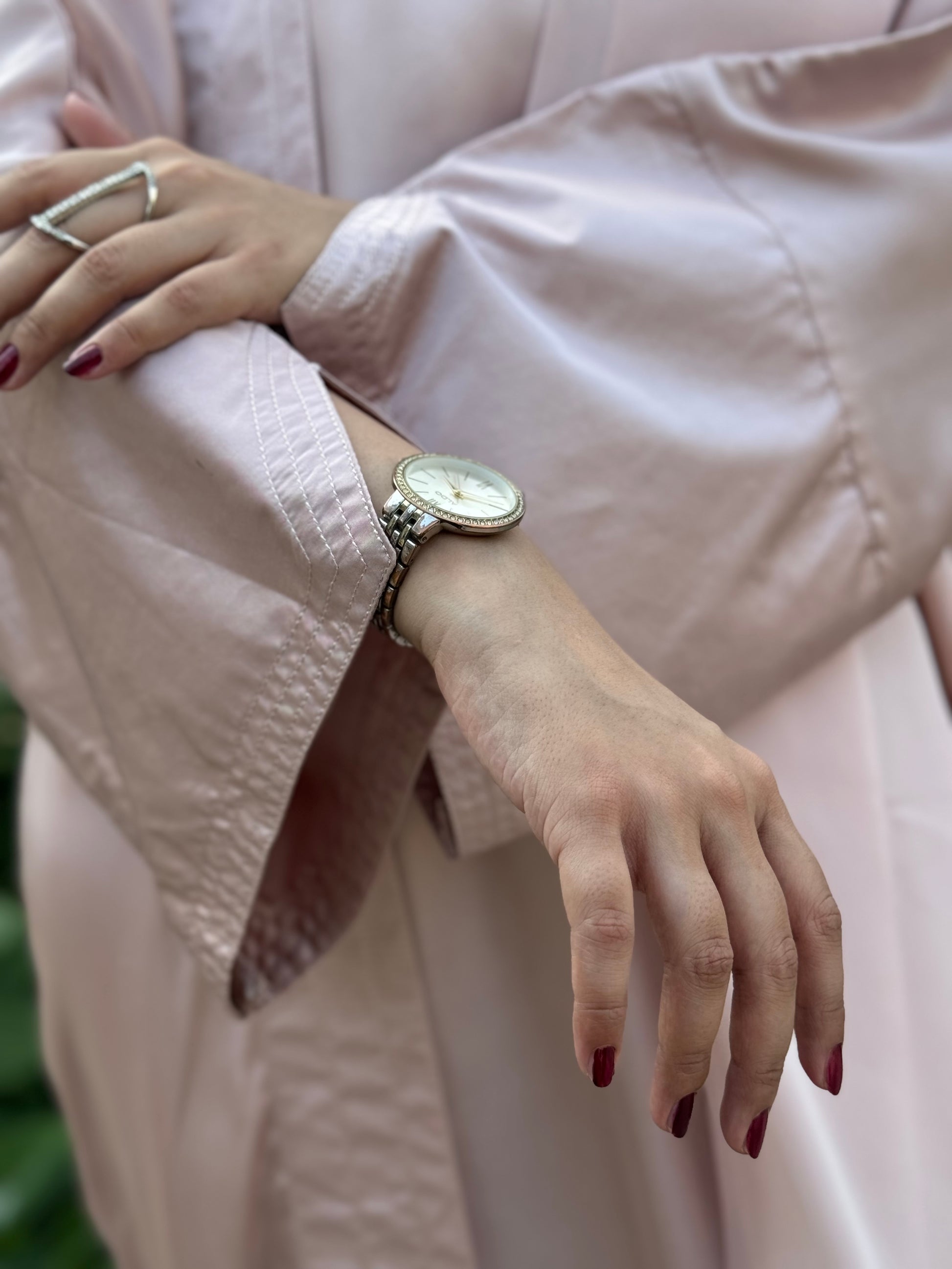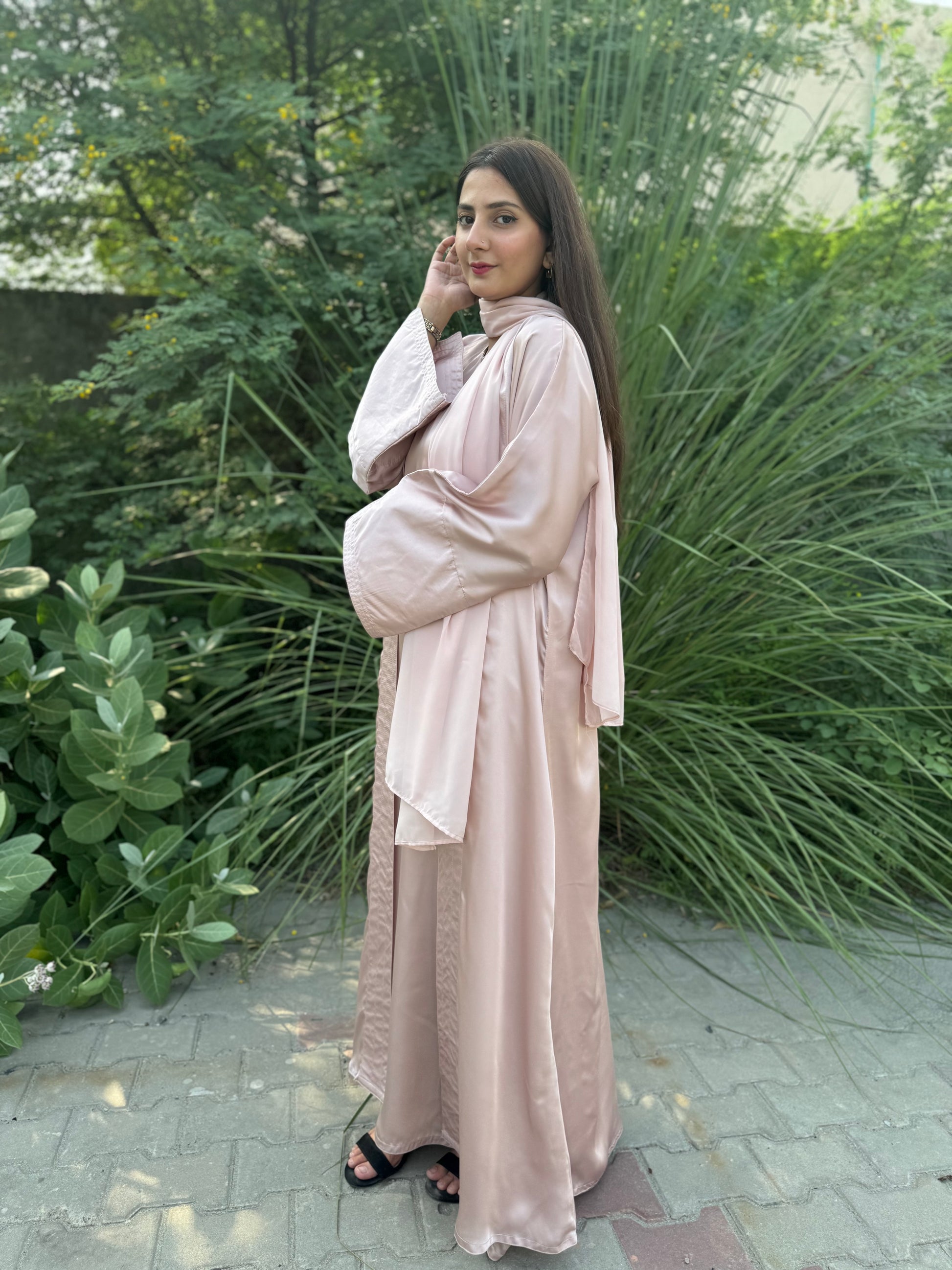 Elevate your wardrobe with our Party wear Pink Abaya, this elegant and stylish Abaya will add a touch of sophistication to any outfit. Abaya set includes a pink hijab in chiffon, pink innerwear in silk fabric and pink outer in silk, detailing on sleeves and detailing on open front, The perfect choice for a modest yet fashionable look.