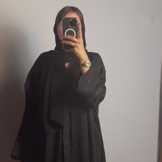 Our Black Simple Abaya, designed to enhance your collection with its classic appeal. Modesty meets the classic style, offers a minimalist style that complements any outfit, designed for special hajj and umrah, making it a versatile addition to your wardrobe, this Abaya set includes a black hijab in chiffon and Matte black abaya in open front with zipper pockets and detailed embroidery on sleeves, A Must-Have for Any Modest Wardrobe.